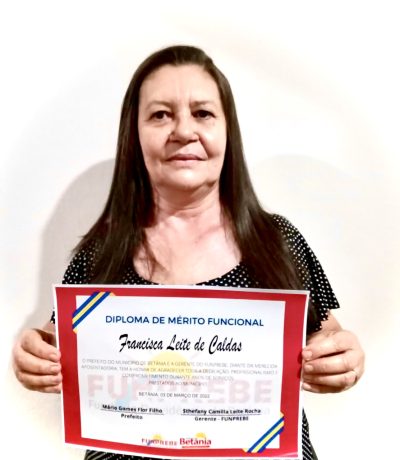 A Sra. Francisca leite de Caldas prestou serviço na Secretaria de Educação, Ciência e Tecnologia, durante 30 anos, 09 meses e 22 dias, onde exerceu a função de Técnico Administrativo, dentre outras, com zelo, esmero, pontualidade, dedicação e responsabilidade. O nosso sucesso é reflexo de sua dedicação.